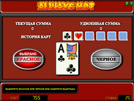Видео слот Всегда Горячо без регистрации предложит вам увеличить ваш выигрыш в стандартной риск-игре с угадыванием карты. Для победы в ней стоит воспользоваться советом, приведённым выше.