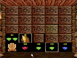 Бонусную игру в автомате Золото Ацтеков онлайн не просто описать, нужно несколько раз ее поймать, чтобы понять, поэтому новичкам очень пригодиться демо режим. Перед Вами возникает пирамида, которая может с трех попыток может поменяться от деревянной (минимальный выигрыш в 10 ставок), до золотой (50 ставок). Если загорелась высшая, бриллиантовая пирамида, то Вас ждет второй раунд. В нем нужно открывать каменные плиты в пяти рядах, первые три ряда принесут 100 % выигрыш, а в верхних двух может оказаться змея, которая закончит игру. Максимальный выигрыш в бонусной игре до 450 суммарных ставок.