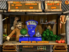 Бонус игра «Арбуз» начинается с появлением на активной линии трех, четырех или пяти кавказцев, с 1, 2 и 3 попытками соответственно. В ней эмоциональный продавец кладет на весы арбуз, чем больше он весит, тем больше сумма выигрыша. Вы можете согласиться с выигрышем и забрать кредиты. А можете заменить арбуз, выигрыш при этом может или увеличиться или уменьшиться.