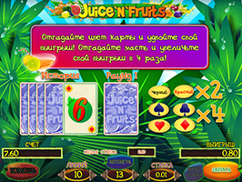 Любой выигрыш в игровом автомате Сок и Фрукты можно увеличить вдвое или вчетверо в игре на удвоение. Для этого нужно угадать цвет карты или ее масть соответственно. Попытки можно повторять до 10 раз, а неудачная попытка сожжёт все заработанные в риск игре кредиты.