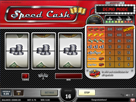 Комбинация совпадает, только в том случае, если символы находятся посредине барабанов. Самый ценный символ в игровом автомате Speed Cash это красные машинки. Это единственный символ, который может совпадать по одному и по два. В первом случае ставка увеличиться в 2 раза, а во втором – в 6. Три машинки по максимальной ставке в три монеты принесут джекпот, а при других ставках увеличат выигрыш в 800 раз!