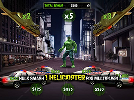 Игровой автомат The Incredible Hulk онлайн построен на приключениях знаменитого супергероя из комиксов Марвел. Кстати, всех фантастических спасателей мира из этих комиксов можно встретить в аппарате Мстители. В аппарате Халк есть все, чего желает душа игрока – символ разброса, запускающий бесплатные ходы, дикий символ, и специальные символы, запускающие бонус игру, в которой нужно крушить машины и вертолеты. Также, в случае если главный герой, являющийся дикарем, совпадет по центру третьего барабана, то он заполняет собой весь барабан и дает 2 повторных запуска, а если на 2-м, 3-м и 4-м, то заполняет их все и дает 1 дополнительный спин.