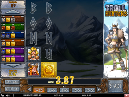 Игровой автомат Troll Hunters без регистрации это интересный и необычный автомат, который, по процессу игры, похож на аппарат Energoonz от того же производителя. Главная его особенность в количестве рядов на пяти барабанах – их 5, а также в том, что символы могут совпадать и по горизонтали и по вертикали. Совпавшие изображения «сгорают», посредине комбинации появляется символ дикаря и следующие комбинации совпадают уже по более высокому коэффициенту. Если таким образом удалось очистить весь игровой экран, то полагается дополнительное вознаграждение в размере 1000 общих ставок. На бонусной игре остановимся поподробнее.